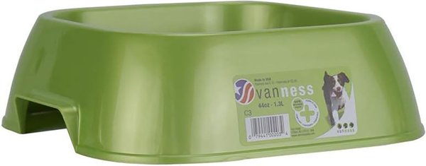 The Van Ness Lightweight Double Plastic Dog & Cat Dish plastic items are manufactured here in the USA and are BPA-free and USFDA food contact approved – humans and animals. It is not recommended to put it in the microwave.