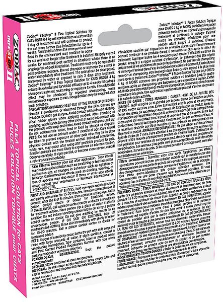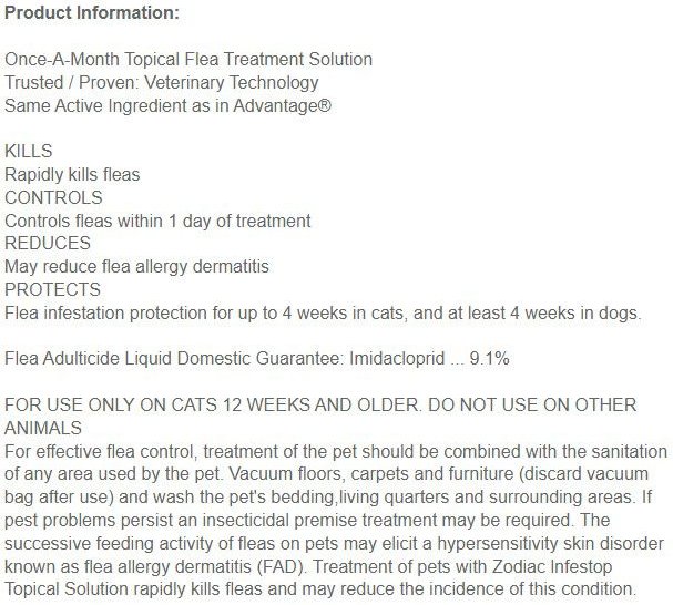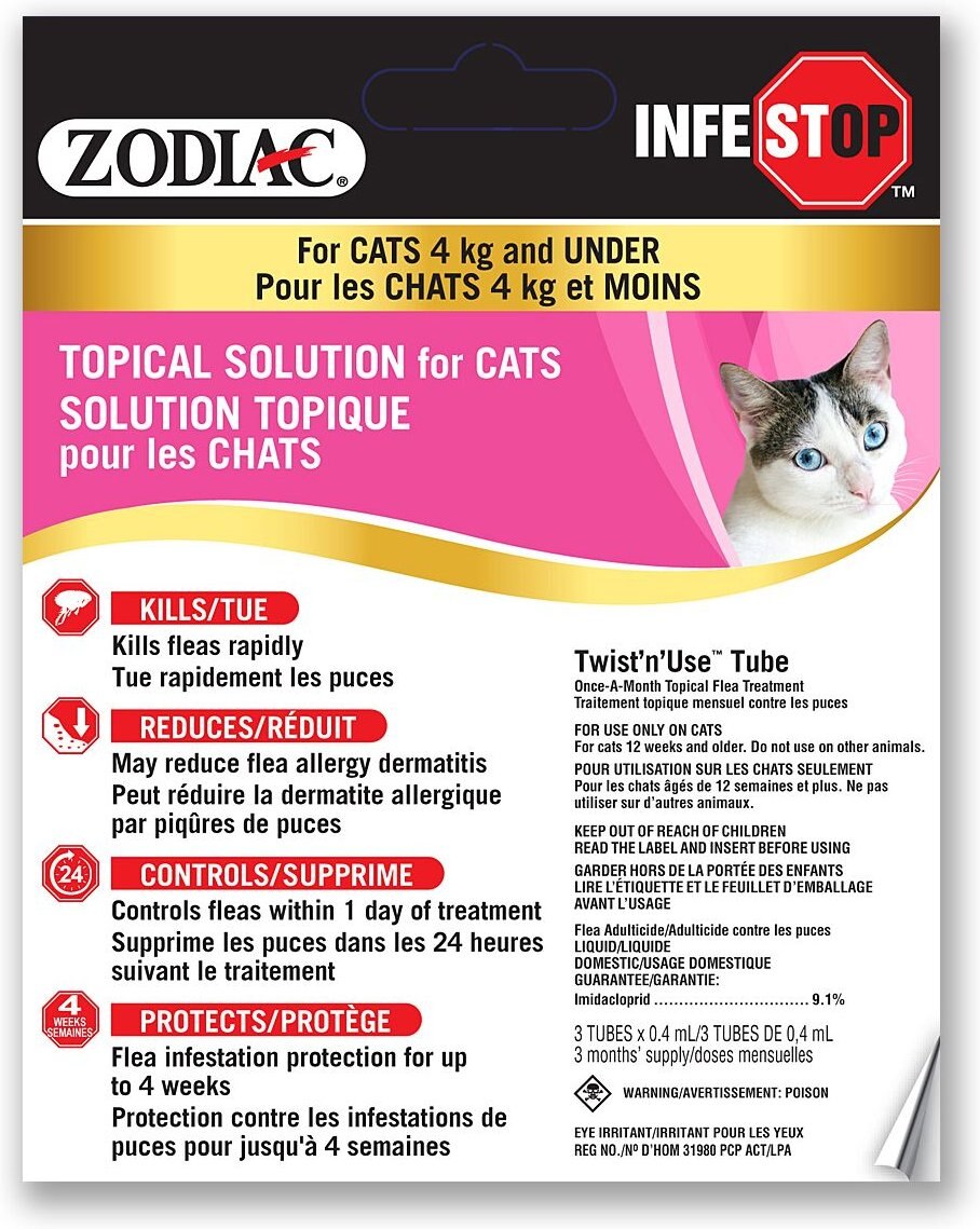Each application of Zodiac Infestop for Cats provides up to four weeks of protection from fleas.