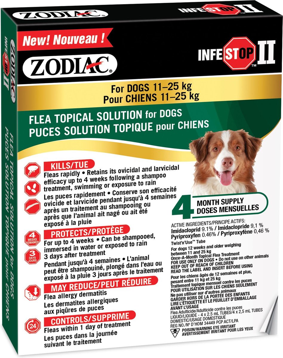 • Available without a visit to the vet, Zodiac Infestop II for Dogs features the same active ingredient as Advantage II (sold separately).