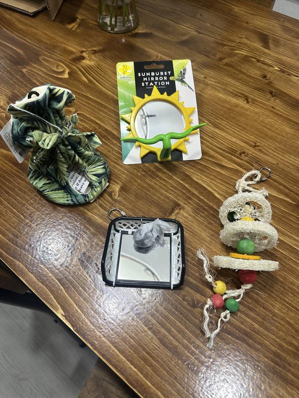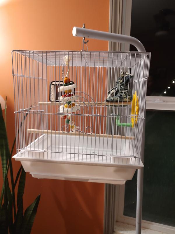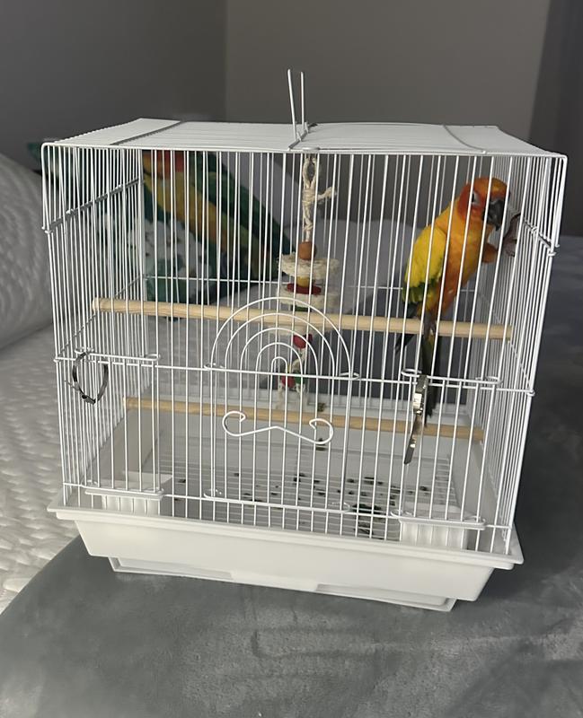 This small but mighty birdcage is perfect for a small budgie or finch. I use it for traveling with my conure. I’m really happy with it. It’s the perfect size for my bird when I have to take her to the vet, or to go sightseeing. It is comfortable enough for short journeys with a conure or cockatiel sized bird. What made it even better was the free little hut that came with it — such a cute touch! It also came with two mirrors that go with it, and my bird loves interacting with them. The included chew toy is a nice bonus and helps keep my bird entertained while we’re on the move. It also has spots for food and water, and a pull out tray to make clean up a breeze. This is super convenient when you’re out and about. Overall, this cage is excellent for what I needed — safe, cozy, and travel-friendly. Highly recommend it for anyone with a small bird looking for a cage.