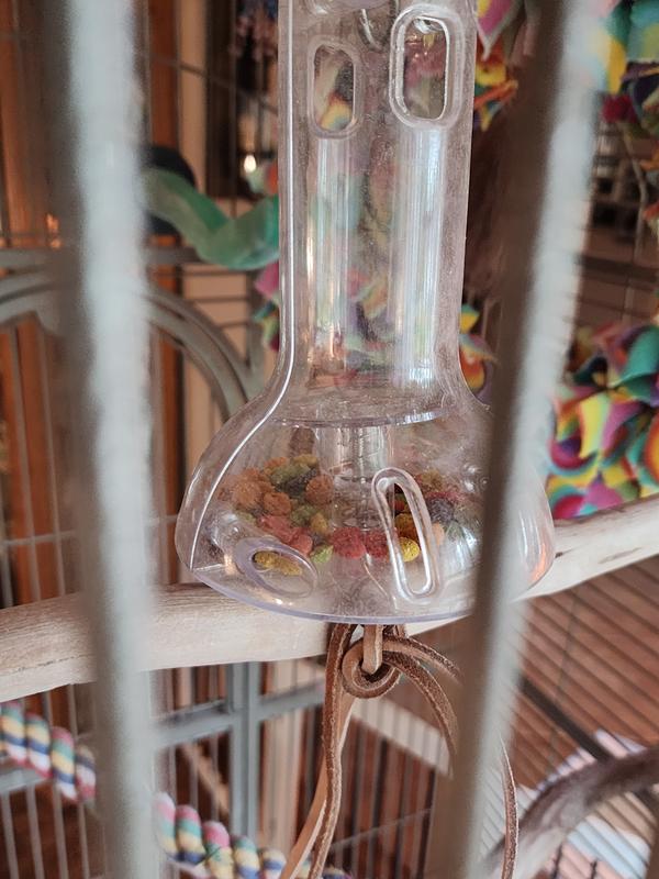 I put this in my Lesser Sulphur -Crested Cockatoo's cage and filled it wit colorul fruit pellets. Benji seems to have figured out how to pull on the leather "pulls"
