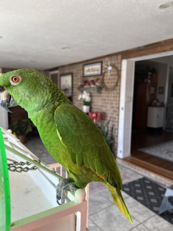 It takes awhile for our parrot to get used to new toys. Maynard loves the hard plastic balls. I decided to move his toy by hanging it off his swing. It really keeps