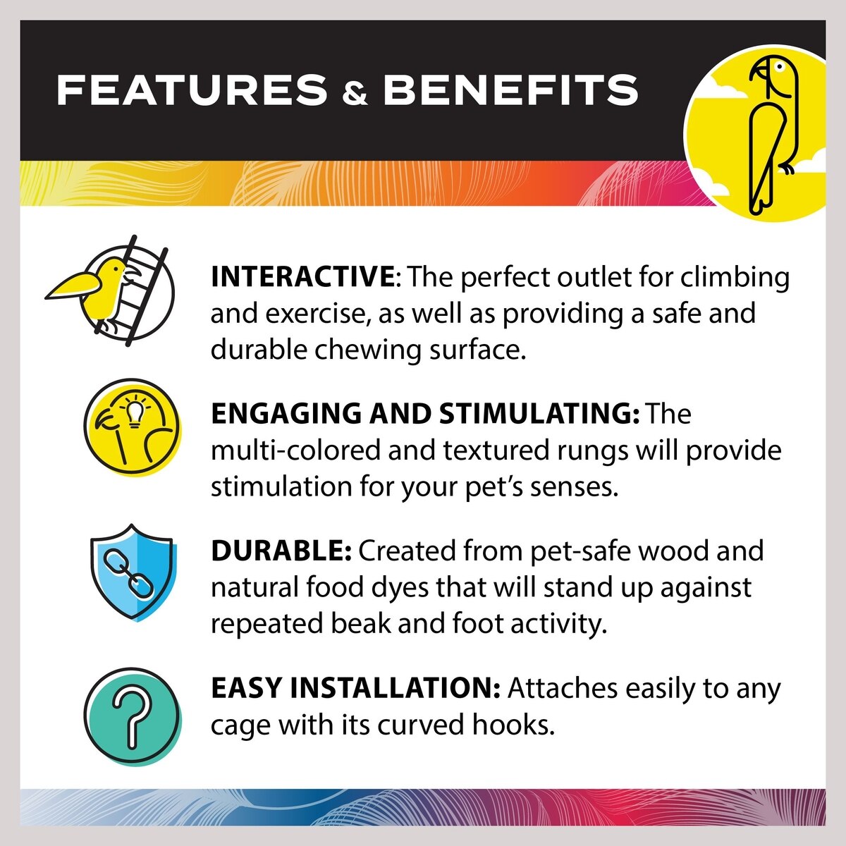 This more heavy duty and more sturdy. It will go into a Caique parrot’s cage. This little guy ripped through his last ladder on no time! This, although not Caique proof, looks much stronger.