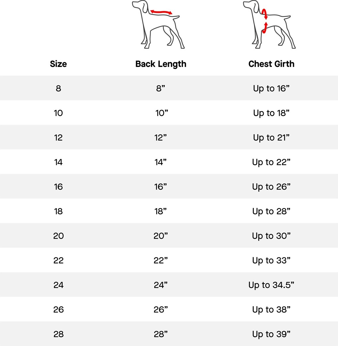 For the best fit, match the below dimensions to your pet's measurements as closely as possible. If your pet falls somewhere between two sizes, we advise ordering the larger of the two.