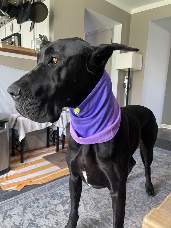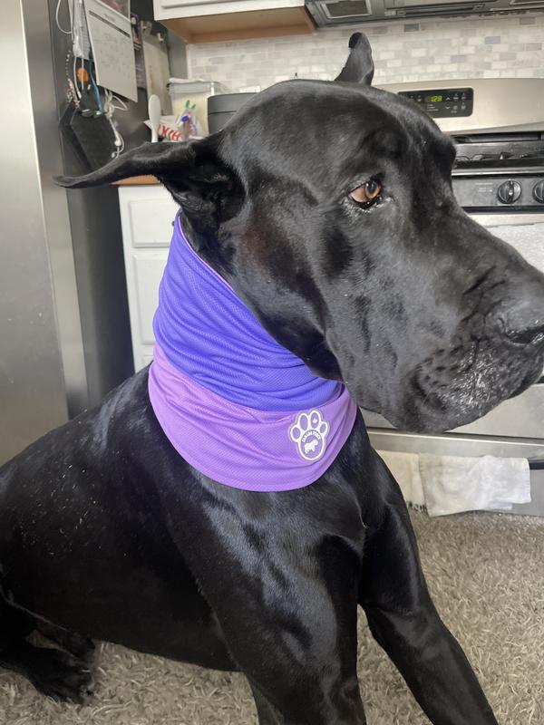 This snood was purchased for a purpose other than its cooling ability. It's material is such that it drapes down the pup's upper chest front the neck, allowing it to protect a patch of irritated skin on my dog's upper chest from hos attempts to scratch it. The material drapes softly & comfortably around the neck & chest. The folds are just enough to protect the skin from scratching, allowing it to heal. In addition, it's well made & looks nice! My dog doesn't mind wearing it, either.