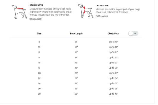 For the best fit, we recommend measuring your pet and matching your pet's measurements as closely as possible to the sizing chart. To measure your pet's body length, measure the base of the neck to the base of the tail. To measure chest girth, measure your pet's chest around the widest part. If your pet falls somewhere between two sizes, we advise ordering the larger of the two. For the complete sizing chart, please refer to the photo below or click the “Size” tab, next to the “Instructions” tab, just under the product photos.