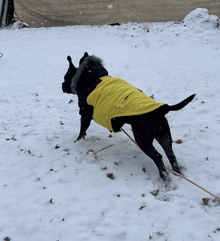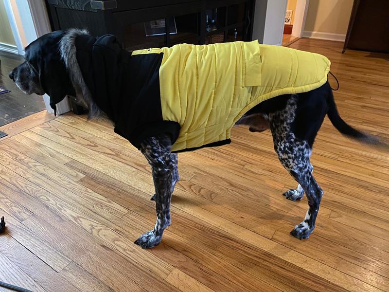 The sizing chart may be located by clicking the “Size” tab, on the product page. To select the best size we recommend that you measure your dog's length and chest girth (circumference). To measure the length you'll measure starting at the base of the neck and end at the base of the tail. To measure the chest girth you'll measure around the broadest part of the rib-cage behind the front legs. If the dog happens to be in between sizes, it's then recommended to select the bigger size. It has a dual velcro closure. The hood is not removable.