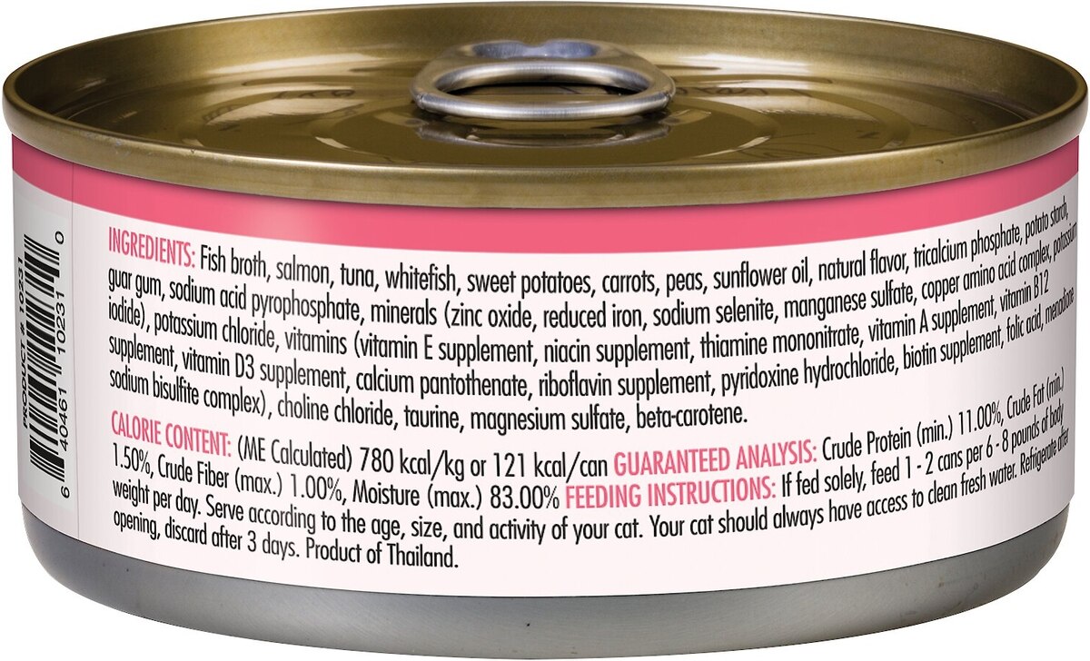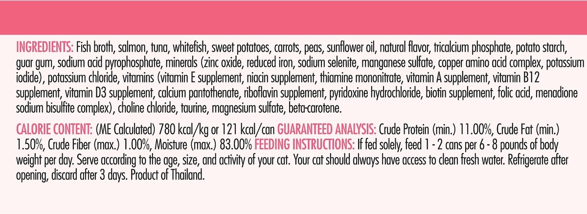 Fish Broth, Salmon, Tuna, Whitefish, Sweet Potatoes, Carrots, Peas, Sunflower Oil, Natural Flavor, Tricalcium Phosphate, Potato Starch, Guar Gum, Sodium Acid Pyrophosphate, Minerals (Zinc Oxide, Reduced Iron, Sodium Selenite, Manganese Sulfate, Copper Amino Acid Complex, Potassium Iodide), Potassium Chloride, Vitamins (Vitamin E Supplement, Niacin Supplement, Thiamine Mononitrate, Vitamin A Supplement, Vitamin B12 Supplement, Vitamin D3 Supplement, Calcium Pantothenate, Riboflavin Supplement, Pyridoxine Hydrochloride, Biotin Supplement, Folic Acid, Menadione Sodium Bisulfite Complex), Choline Chloride, Taurine, Magnesium Sulfate, Beta-Carotene.
