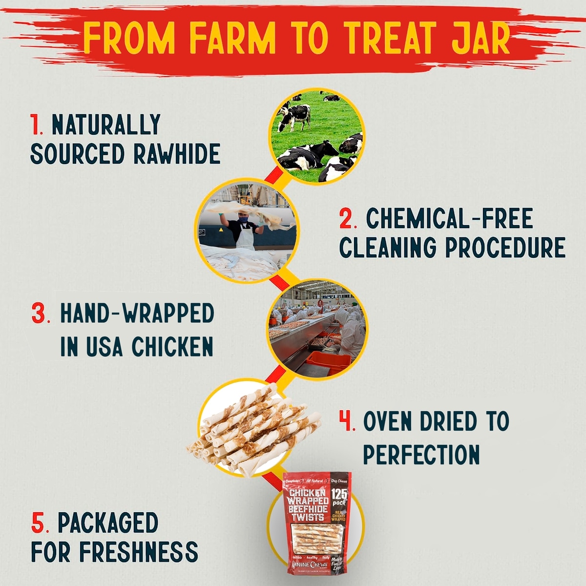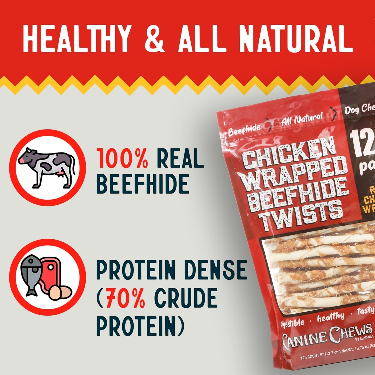 These treats combine USA sourced chicken with real beef hide for optimum taste and palatability.