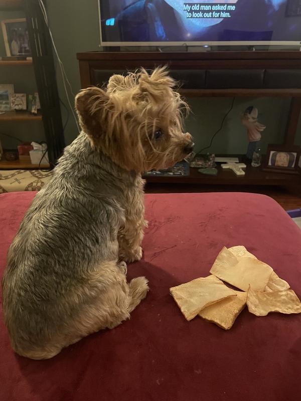 My pup, who is 8 years old, plays with these treats by throwing them up in the air. It takes her quite some time to get through one. She’ll chew for a few days, on and off. That is all fine, but I thought the treat would be more like a “chip” ... like it suggests in the name. So I didn’t get what I thought I’d ordered. None the less, I don’t think my pup will reject them completely.