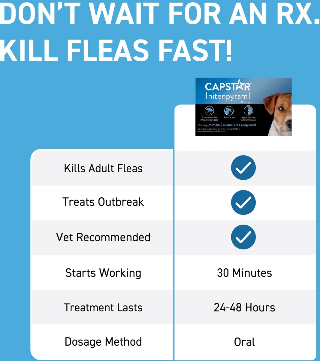 Fleas act fast—in just 24 to 48 hours, fleas can start laying eggs and quickly become a nightmare. Capstar begins killing fleas in just 30 minutes with a single dose. Watch them fall fast with Capstar and stop an infestation dead in its tracks.