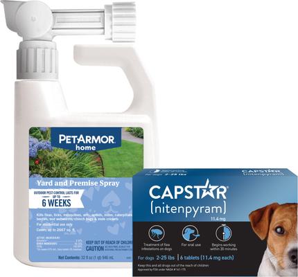 PetArmor Home Yard & Premise Flea & Tick Spray Treatment—Help protect your yard from pet-pestering bugs with PetArmor Home Yard and Premise Flea and Tick Spray. This spray is formulated to kill fleas, mosquitoes, ticks, and a whole host of other pesky insects. The convenient applicator can be attached to your hose for a concentrated spray and the fast-acting formula works to kill bugs on contact. It provides over 2,000 square feet of coverage and helps control outdoor pests for up to six weeks. This spray helps keep your yard a playground for your pal—and not for unwanted pests!