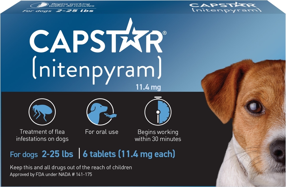Capstar Flea Oral Treatment for Dogs, 2-25 lbs—Help keep your pal pest-free with the Capstar Flea Tablets for Dogs. Each tablet contains an active ingredient called Nitenpyram that’s effective in eliminating fleas in dogs and puppies. The fast-acting formula starts working within 30 minutes and has been proven to be more than 90% effective in eliminating adult fleas within just hours. That means less itchiness and discomfort for your pooch, much faster—and without the mess and odors of a topical solution. Just give the tablet as directed, and let the formula do its work. A single dose should do it, but it’s also safe to keep giving daily if your pal gets infested again, until all the fleas are gone.