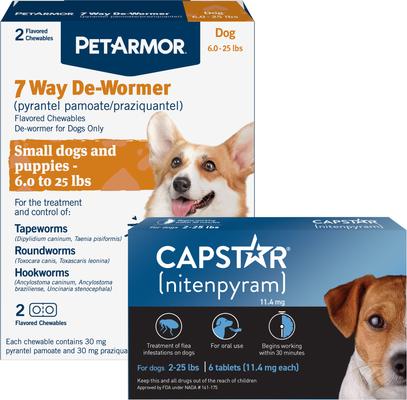PetArmor 7 Way Dewormer for Hookworms, Roundworms & Tapeworms for Small Breed Dogs—Protect your pup from pesky parasites with PetArmor 7 Way Wormer Chewable Tablets for Puppies & Small Dogs. These tasty chewable tablets make treating and controlling worms as easy as giving a treat, for a simple-to-use, at-home solution that can’t be beat. The dewormer targets two types of tapeworm, two types of roundworm, and three species of hookworm, for seven-way canine parasite elimination and protection you can rely on. Give the recommended number of tablets directly to your small dog or puppy to chew or hide them in a treat—your buddy will love his yummy de-worming regimen, and you’ll love the ease and convenience!