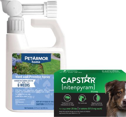 PetArmor Home Yard & Premise Flea & Tick Spray Treatment—Help protect your yard from pet-pestering bugs with PetArmor Home Yard and Premise Flea and Tick Spray. This spray is formulated to kill fleas, mosquitoes, ticks, and a whole host of other pesky insects. The convenient applicator can be attached to your hose for a concentrated spray and the fast-acting formula works to kill bugs on contact. It provides over 2,000 square feet of coverage and helps control outdoor pests for up to six weeks. This spray helps keep your yard a playground for your pal—and not for unwanted pests!