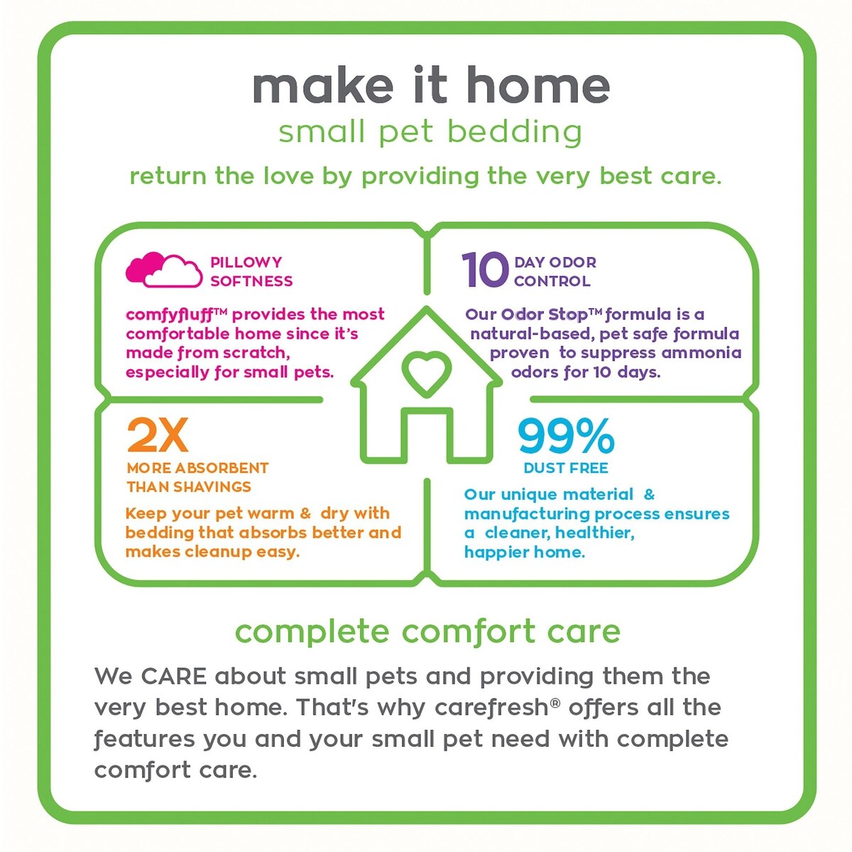 As a trusted brand for small pets since 1985, Carefresh all-natural cloud-like bedding is free of harmful chemicals and pollutants and made with natural reclaimed paper fiber from sustainable sources. Show your small pet the love with Carefresh.