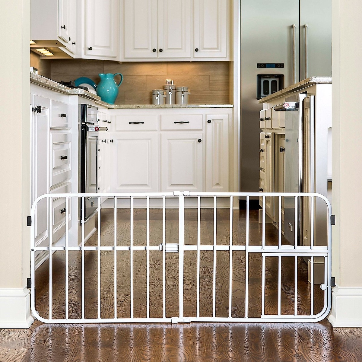 Love the gate because it’s easy to step over without tripping, but it also keeps my dogs away from the cat area. The door is a perfect-size for the cats to come and go as they please and again keep the dogs out. It’s also just tall enough that my Frenchie can’t over it to get to the cat food.