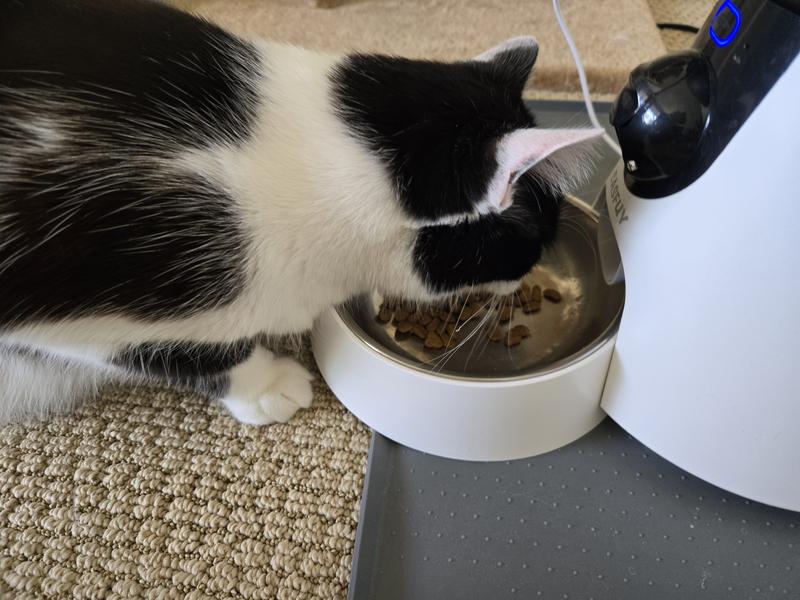 Love the design, it’s perfect in every room of the house. The app is so easy to install and to use. The camera is amazing, very high definition and night view works perfectly. I love the possibility to see my cat, listen to him and speak with him. The mic works perfectly too! My cat got used to this feeder immediately and he runs as soon as he hears dry food falling into the bowl. It’s very easy to set up portions and control how much he’s eating. Highly recommended!