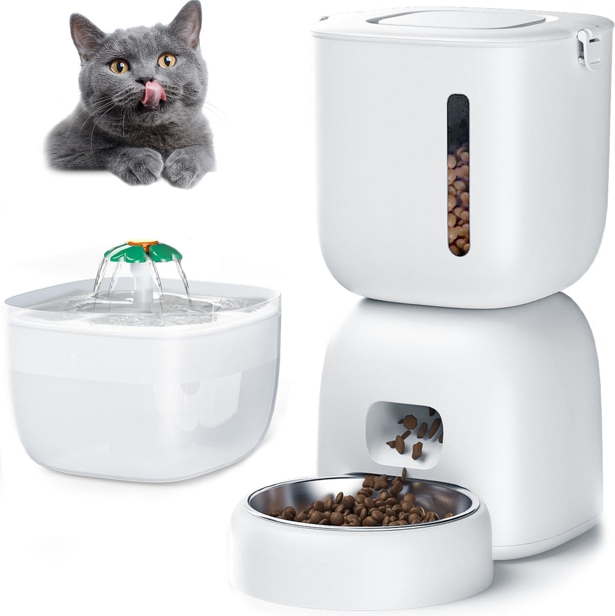 Casfuy 2-in-1 Automatic Cat Feeder & Water Fountain Set, White, 3-L & 2-L