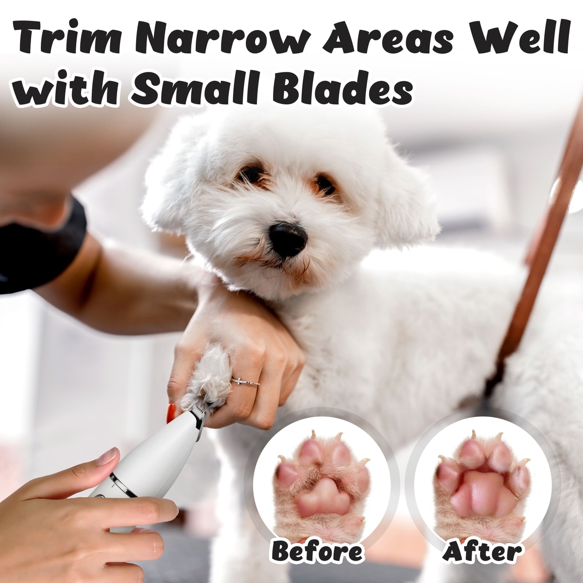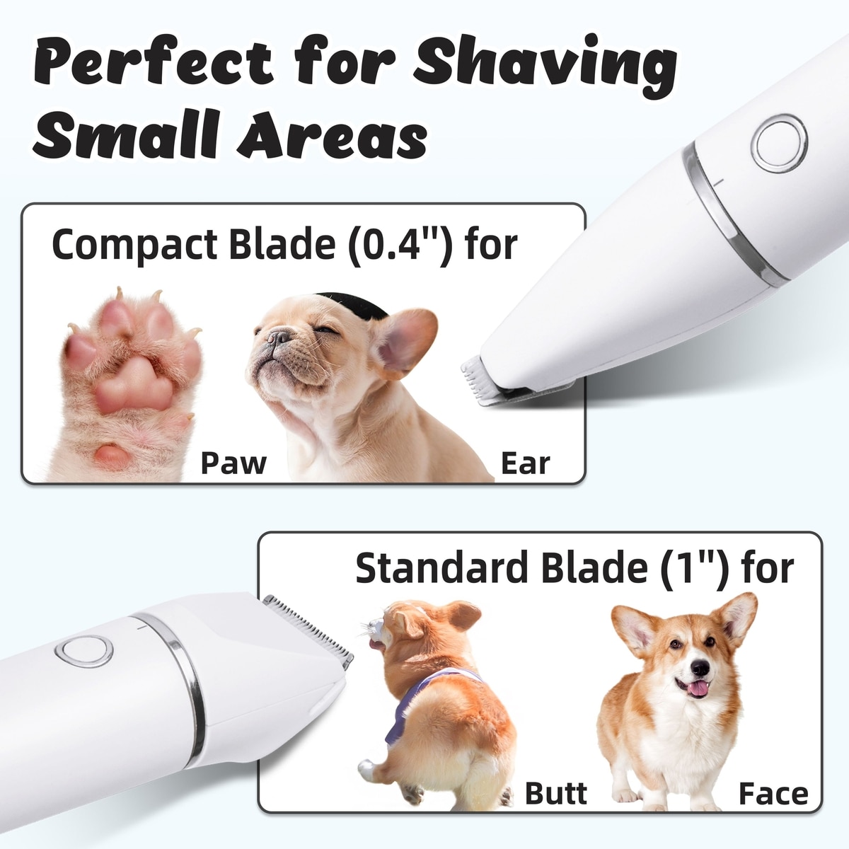 Includes a standard head (1") and a compact head (0.4") for trimming hair in different areas, such as ears, face, paws, and rump.