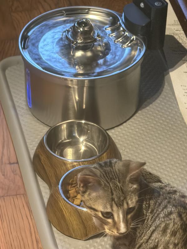 We have been making a concerted effort to move away from plastics in our lives and decided if we don’t want to eat/drink from plastic, why do we expect any different for our two cats. We’ve had a flower water fountain for years and our Kiki has specially liked the water that flowed from the fountain. It took about a week for the girls to get used to the foreign object in the house, but once they accepted that it was not a threat, they took right to it. Kiki really loves the water in this new fountain and we are happy knowing they are drinking water out of a stainless bowl. It is very quiet in the house. We travel in a camper a lot - we are hoping it will be equally quiet inside the smaller space.