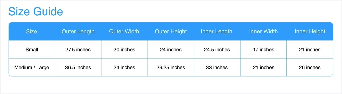 The inner dimensions of the small crate are 24.5 inches in length, 17 inches in width, by 21 inches in height. The inner dimensions of the medium/large are 33 inches in length, 21 inches in width, by 26 inches in height.