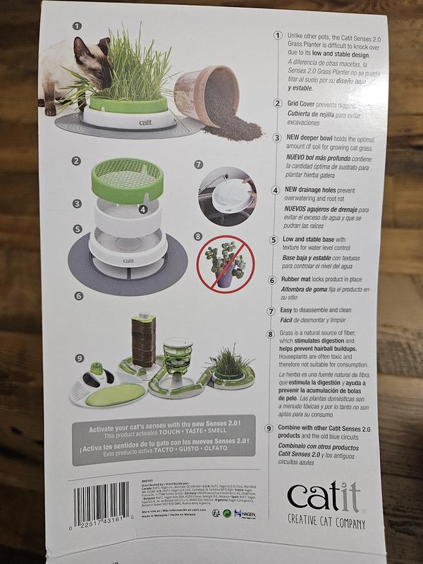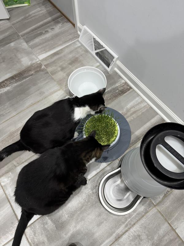 Works great, the container keeps grass in place but easy for cats to eat. Wish refills were available at Chewy. They have to be purchased from Catit.