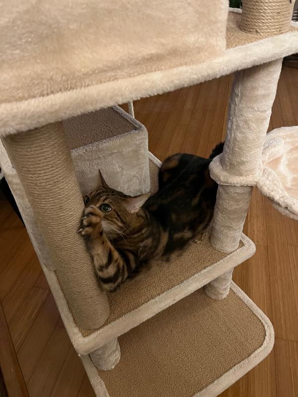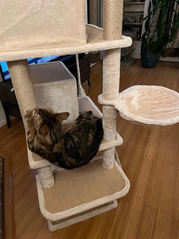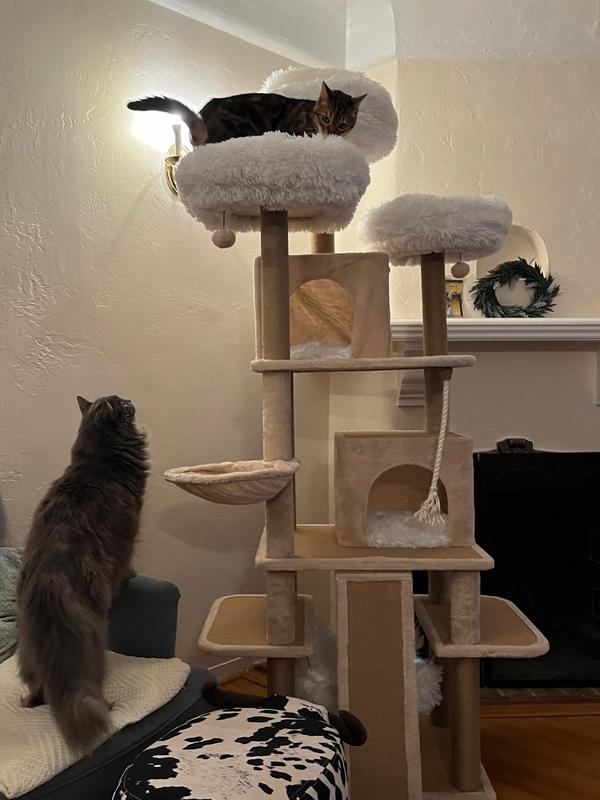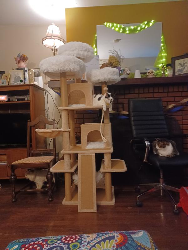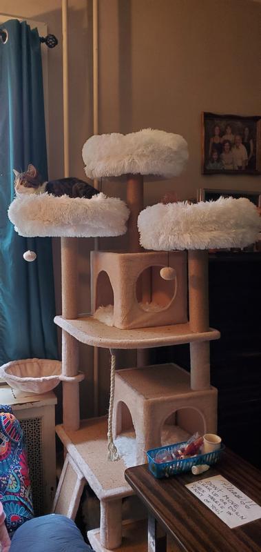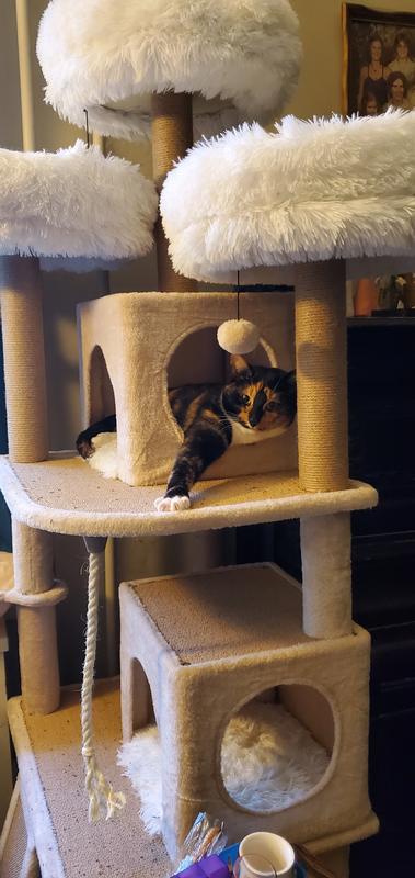 This is a very nice cat tree with lots of beautiful features. It's nice and heavy, so it doesn't move when the cats jump on it. It has beautiful, soft places for