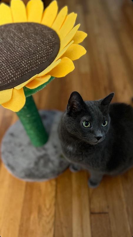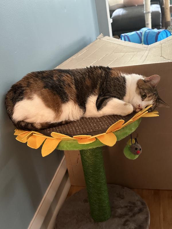 Both of my cats get enjoyment out of this sunflower scratching post/lounger, but my *ahem* petite girl fits a little better on it so she’s always up there. I’ve