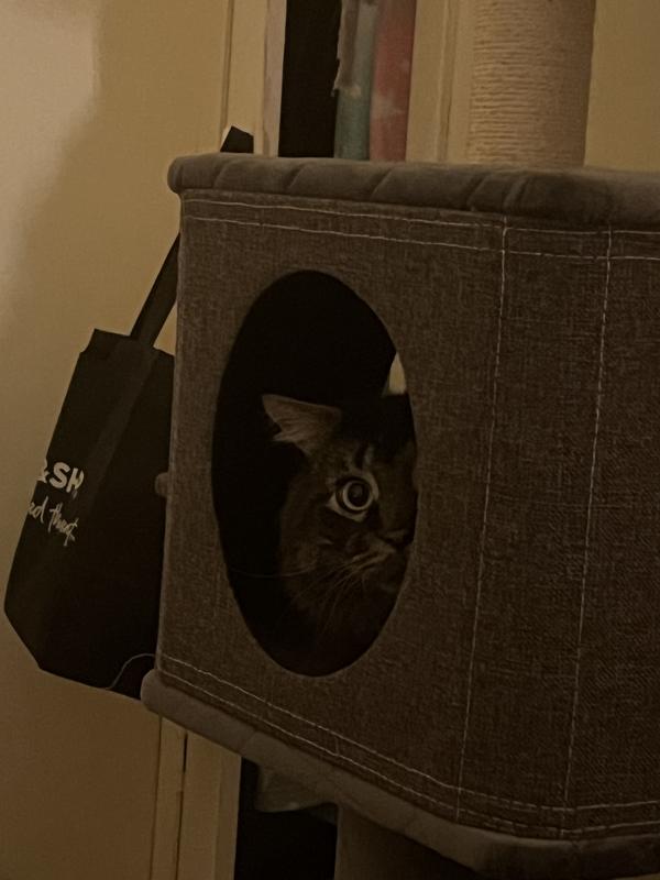 My cats like this condo. It’s a nice size, doesn’t take over the room. Looks good. I would give a 5 rating if the bed bottom was a tad bit thicker and the bumpers on the bed a bit more sturdier w/ less give.