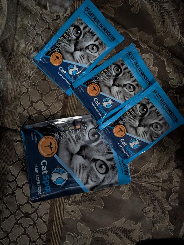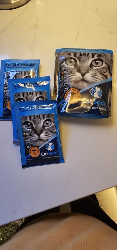 Cat Spot health indicator is a granular plant based additive for your litter box. It comes in a bag with 3 smaller individual use packages. You simple open a package and sprinkle on the top of a clean litter box. I like the product in theory - as an easy way to check in and see how your cat is doing health wise. However if you have more than one cat there is no way to tell which one could be having possible health issues without separating them so only one cat has access to the box at a time. The granuals were larger than I expected and easy to spot when sprinkled on top of the litter. However the colors they can change to are pretty similar and can be difficult to differentiate on the ‘health test scale’.