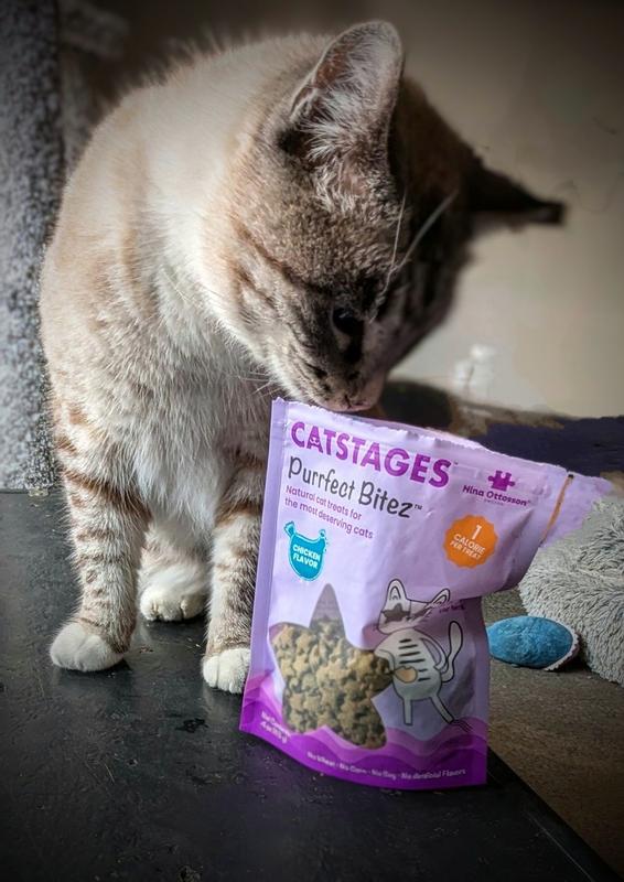 My Dawgiecat can be finicky, but he absolutely loves these purrfect bitez! They're made with real chicken and other good stuff. Only 1 calorie per treat so he can