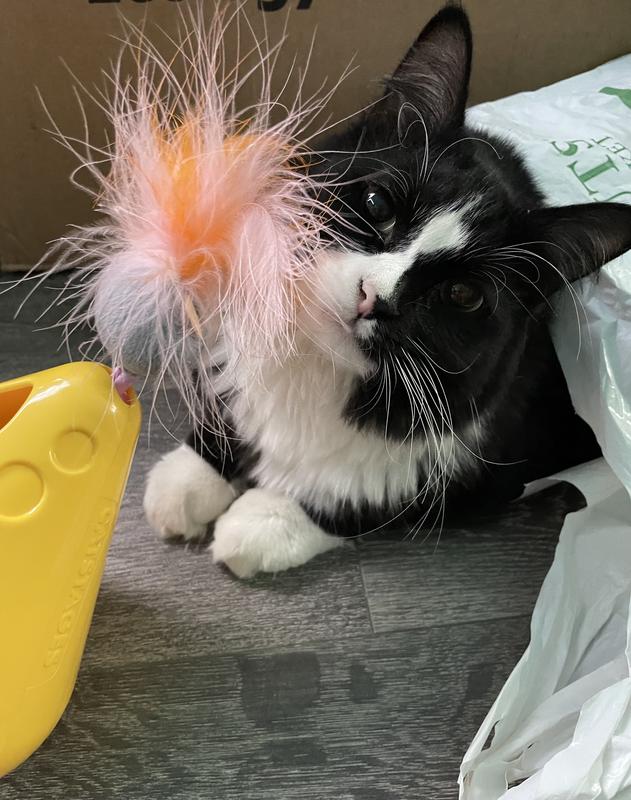 The perfect prey, complete with catnip, feathers, ribbons, and crinkle sounds to satisfy any cat’s sweet tooth.
