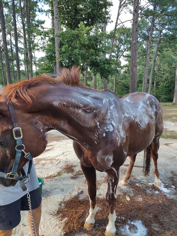 My horse had rolled in sand with her fly sheet on and was really sweaty on a hot day, so I took the opportunity to bathe her with this. I liked how it lathered,