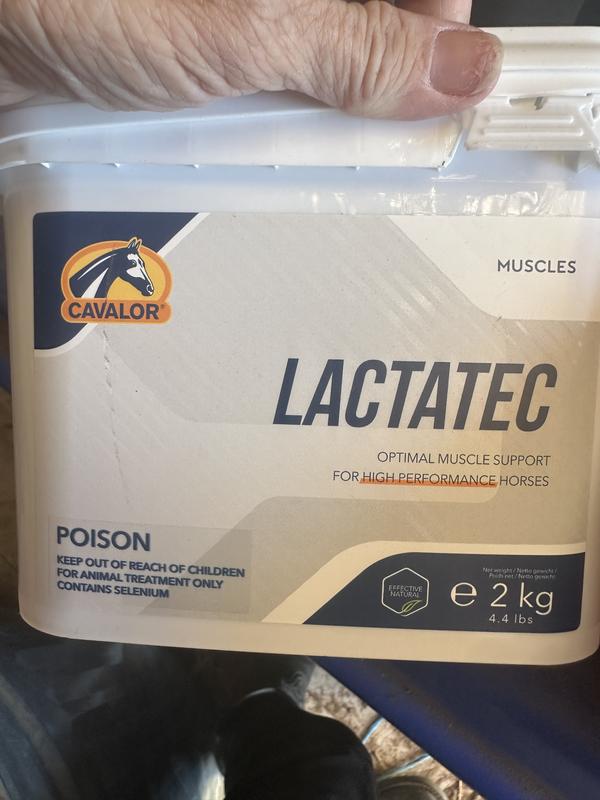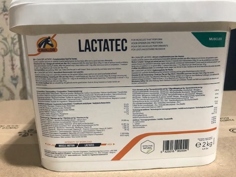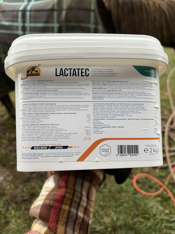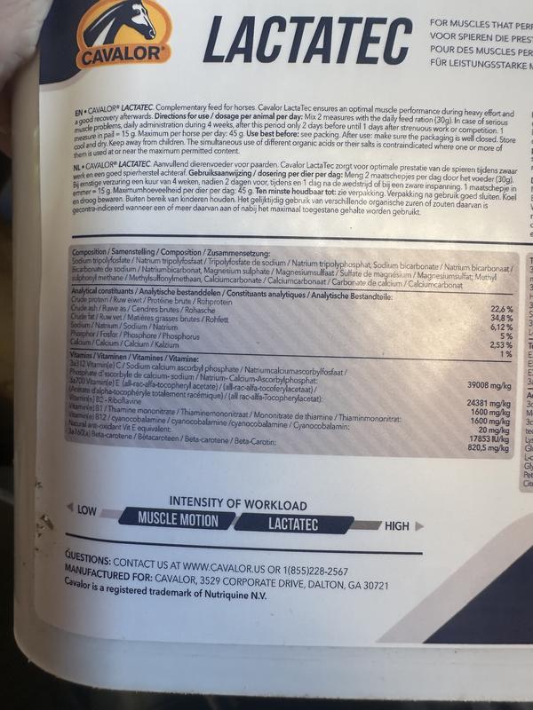 Mix 30 g into feed daily. In horses prone to severe acidosis, start with a 4-week regimen of Cavalor LactaTec, followed by 2 days before, during, and 1 day after competition or intense exercise. 1 measuring scoop = 15 g. Maximum 45 g per horse per day.