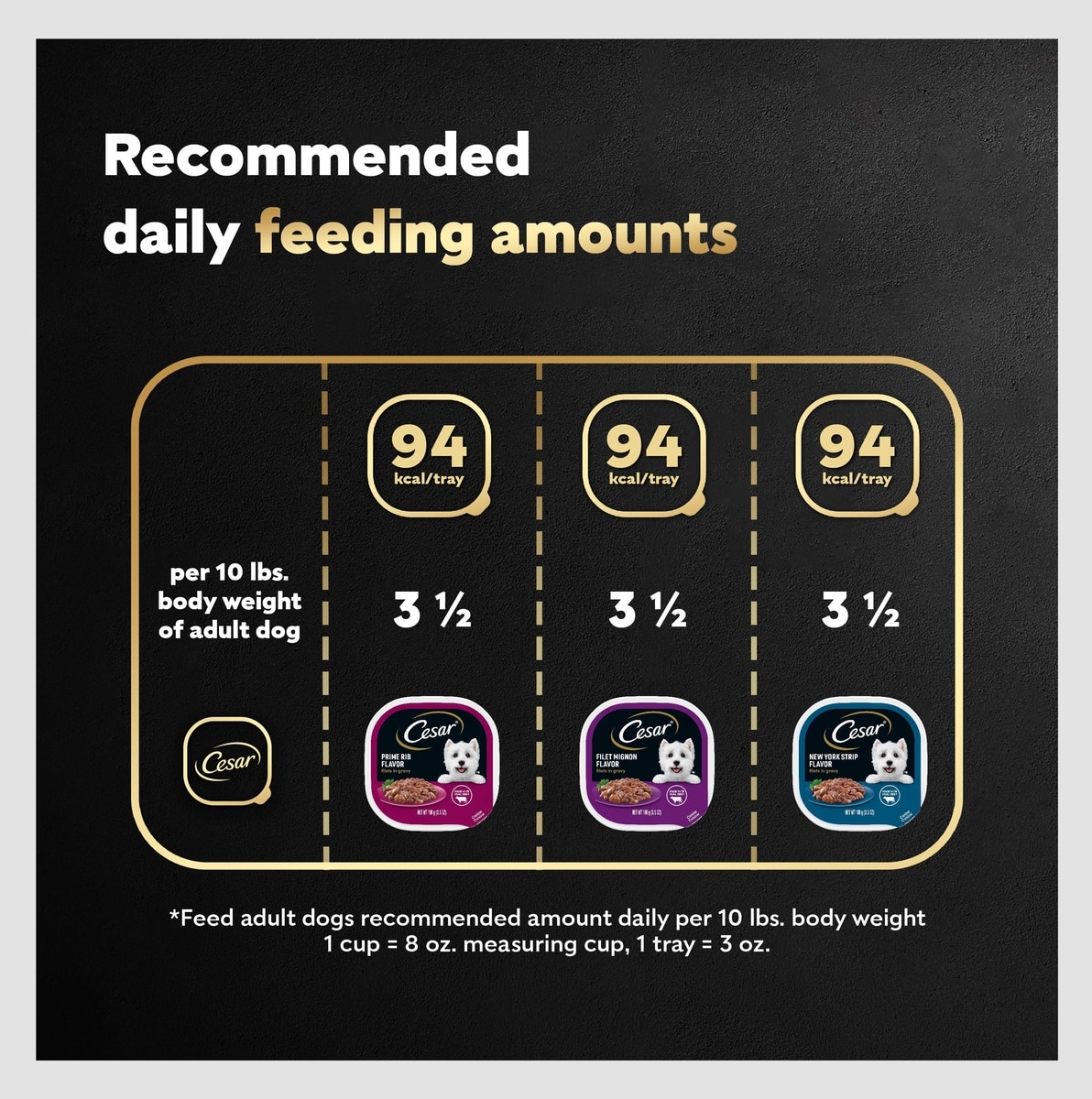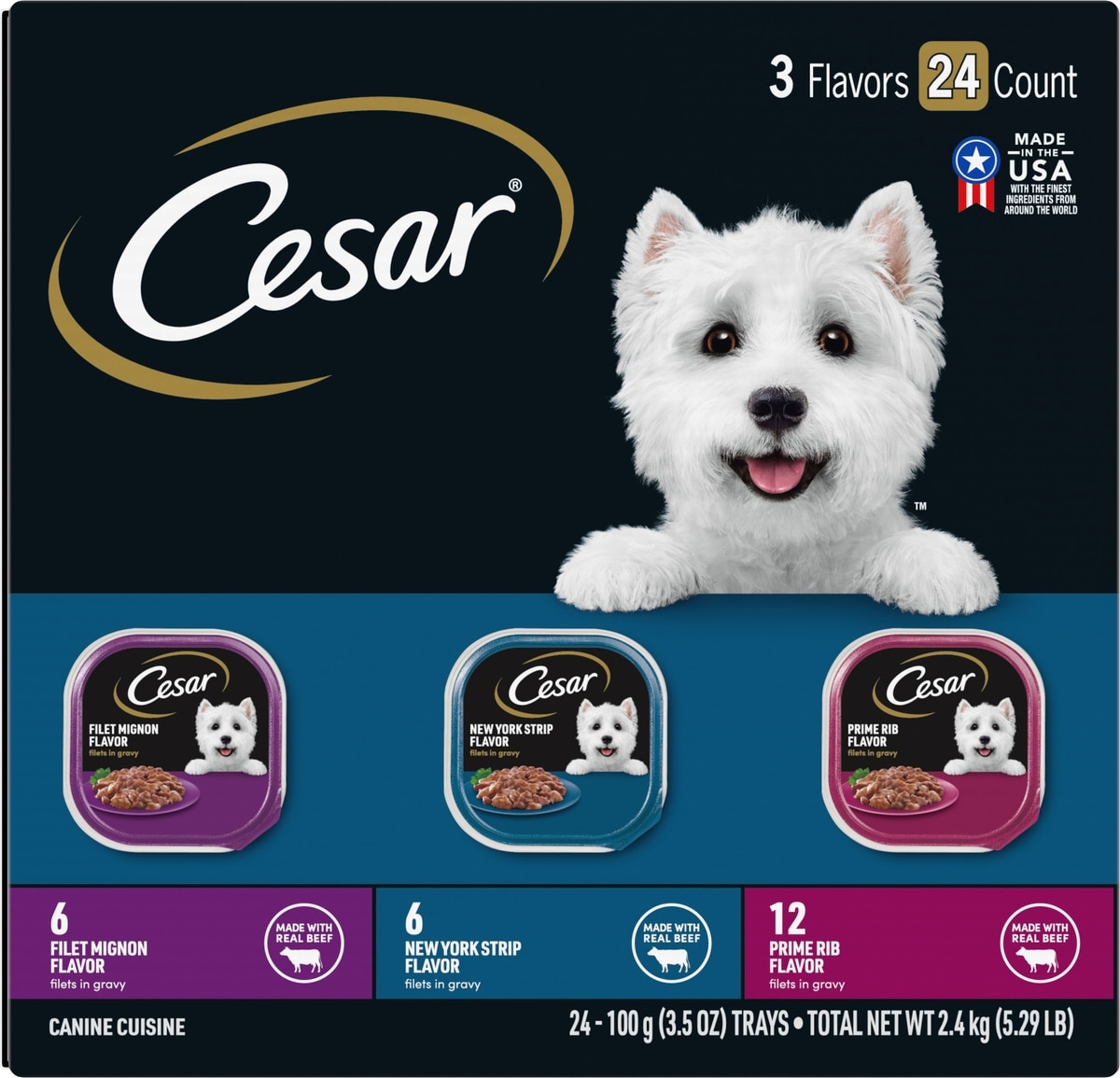 - DealCesar Classic Loaf in Sauce Beef Recipe, Filet Mignon, Grilled Chicken & Porterhouse Steak Flavors Variety Pack Grain-Free Small Breed Adult Wet Dog Food Trays, 3.5-oz, case of 24$24.94 Chewy Price$33.36 List Price$23.69 Autoship PricePromo, New Customers Only: Spend $49+, Get $20 eGift Card