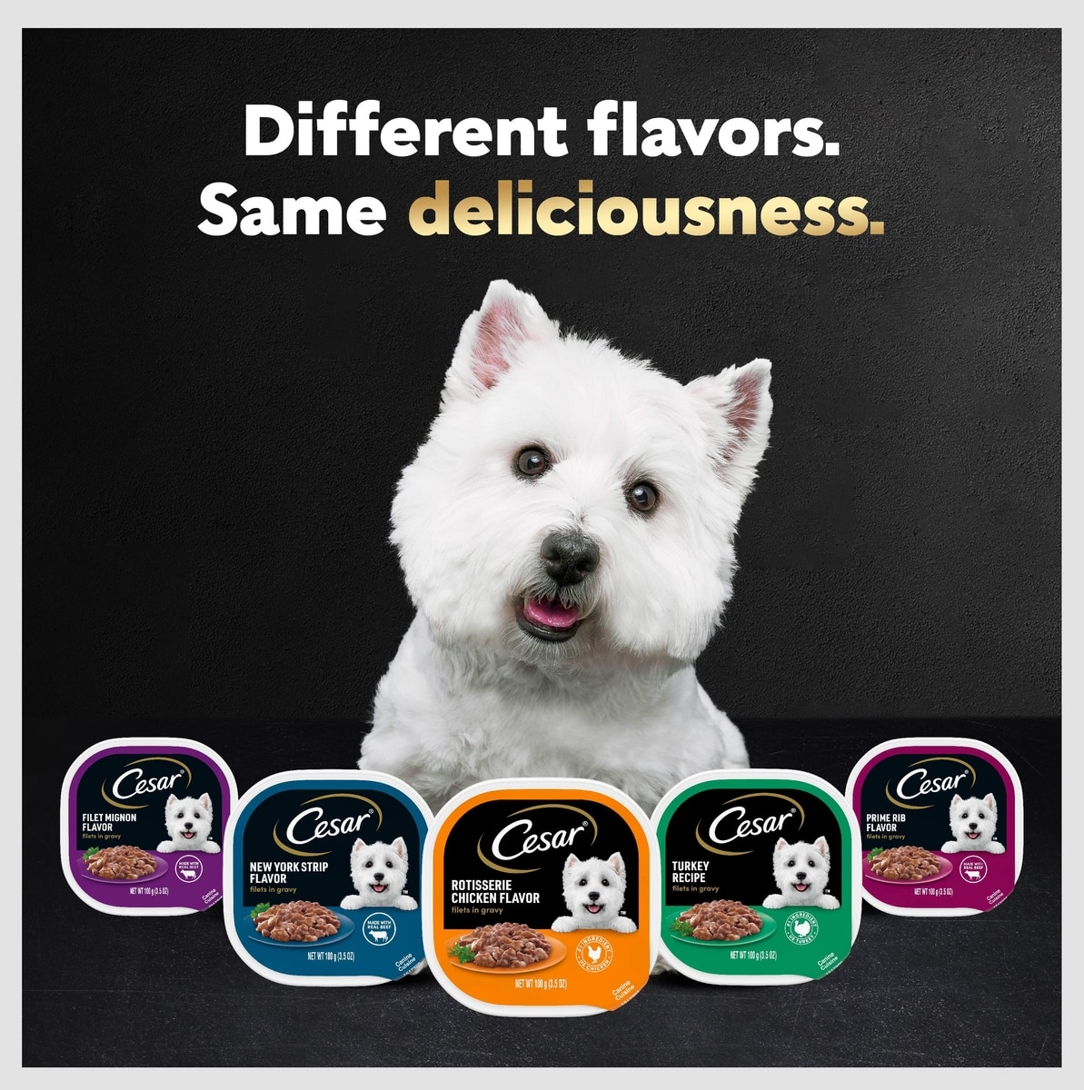 - Cesar Poultry Lovers Turkey & Chicken Filets in Gravy Variety Pack Small Breed Adult Wet Dog Food Trays, 3.5-oz, case of 12$13.94 Chewy Price$15.99 List Price$13.24 Autoship PricePromo, New Customers Only: Spend $49+, Get $20 eGift Card