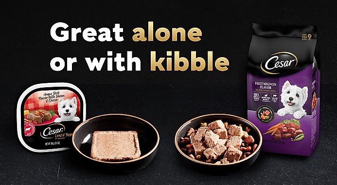 Cesar Loaf and Topper varieties are gourmet meals—or tasty meal complements—designed with small dogs in mind.