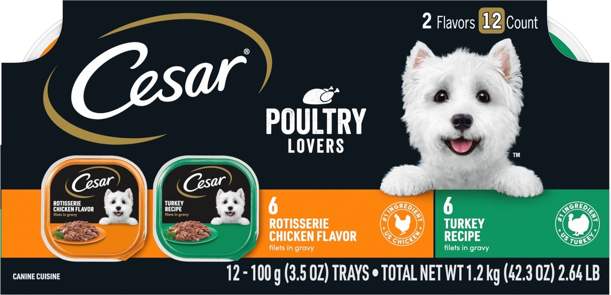 Cesar Poultry Lovers Turkey & Chicken Filets in Gravy Variety Pack Small Breed Adult Wet Dog Food Trays, 3.5-oz, case of 12