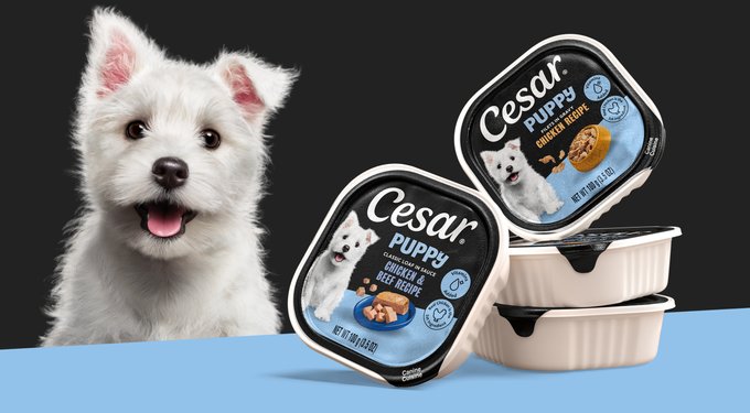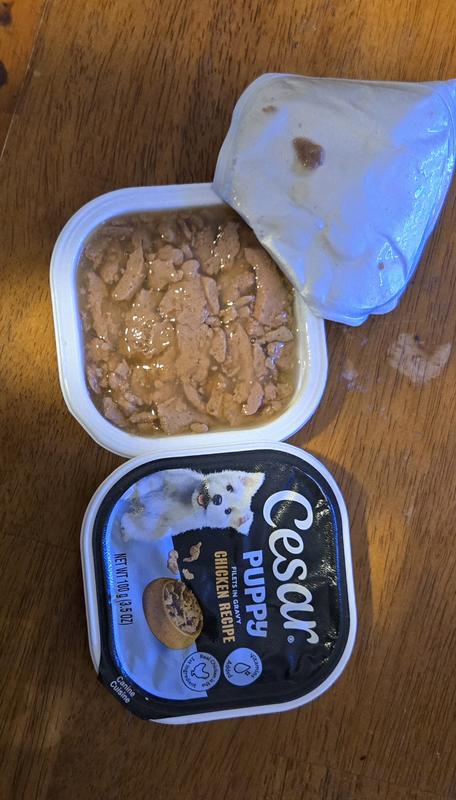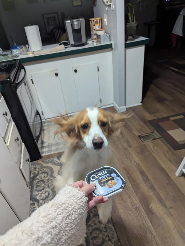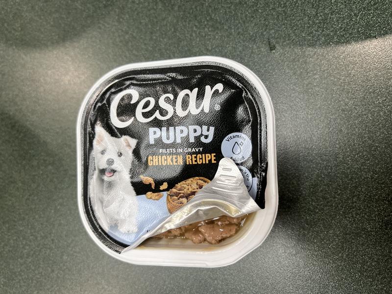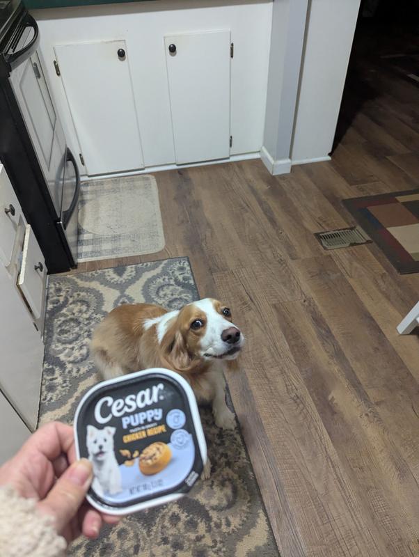 Elevate your puppy’s mealtime with a recipe that is 100% complete and balanced for puppies. Each serving of Cesar Puppy gourmet soft dog food is served in convenient trays with easy, peel-away seals. It can be enjoyed on its own or mix it in with dry kibble. Cesar Puppy is easy to digest, but hard for your pup to resist!