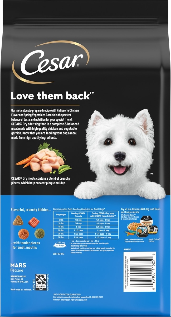 - Cesar Porterhouse Flavor & Spring Vegetables Garnish Small Breed Adult Dry Dog Food, 5-lb bag$11.98 Chewy Price$12.99 List Price$11.38 Autoship PricePromo, New Customers Only: Spend $49+, Get $20 eGift Card +1 deal