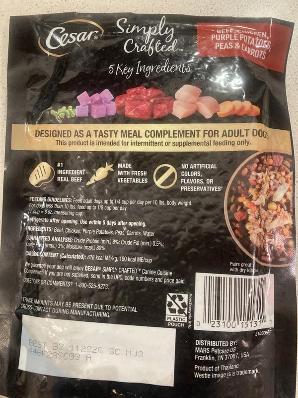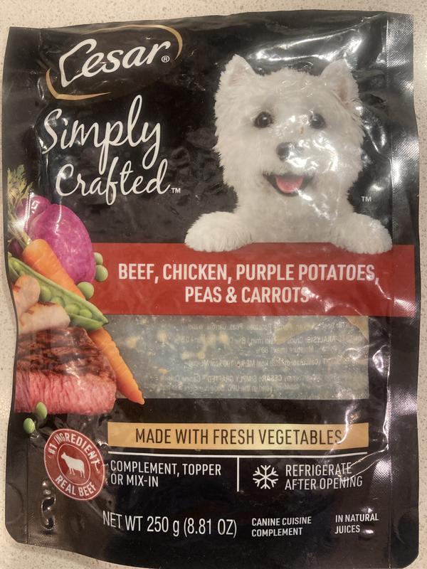 - Cesar Simply Crafted Beef, Chicken, Purple Potatoes, Peas & Carrots Adult Wet Dog Food Topper, 1.3-oz, case of 10$21.90 Chewy Price$20.80 Autoship PricePromo, New Customers Only: Spend $49+, Get $20 eGift Card