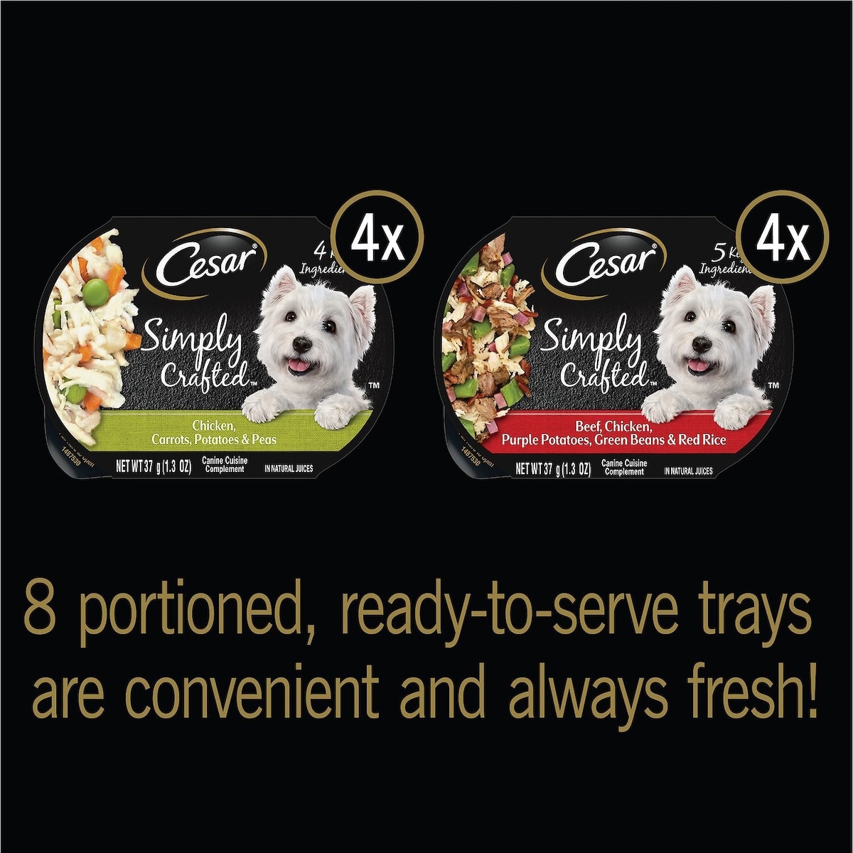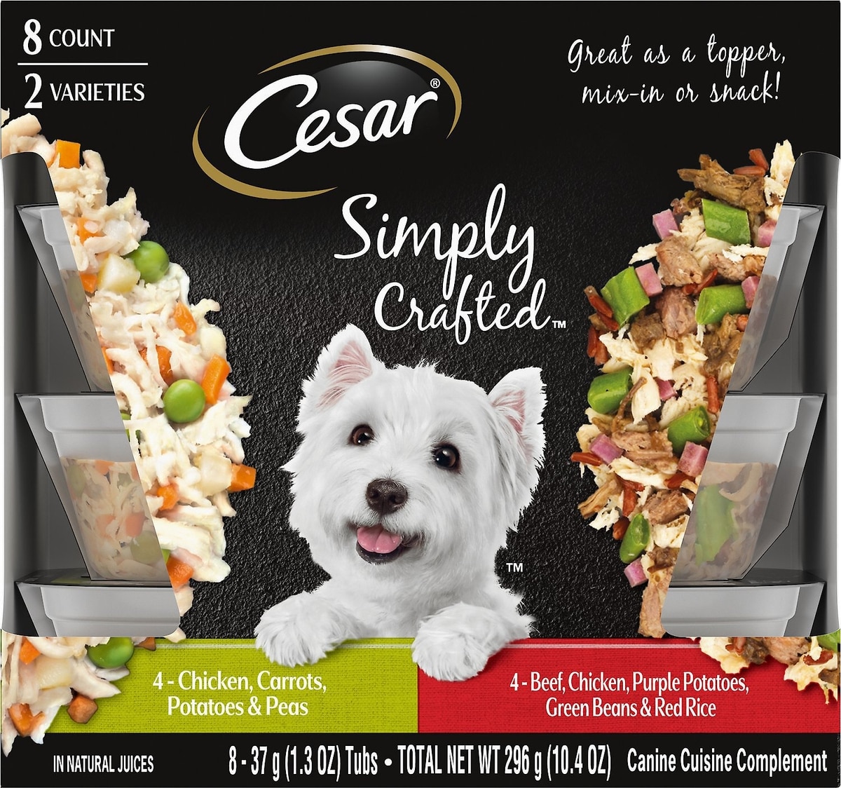 - Cesar Simply Crafted Variety Pack Chicken, Carrots & Green Beans & Beef, Chicken, Purple Potatoes, Peas & Carrots Wet Dog Food Topper, 1.3-oz can, 16 count$27.96 Chewy Price$29.99 List Price$26.56 Autoship PricePromo, New Customers Only: Spend $49+, Get $20 eGift Card