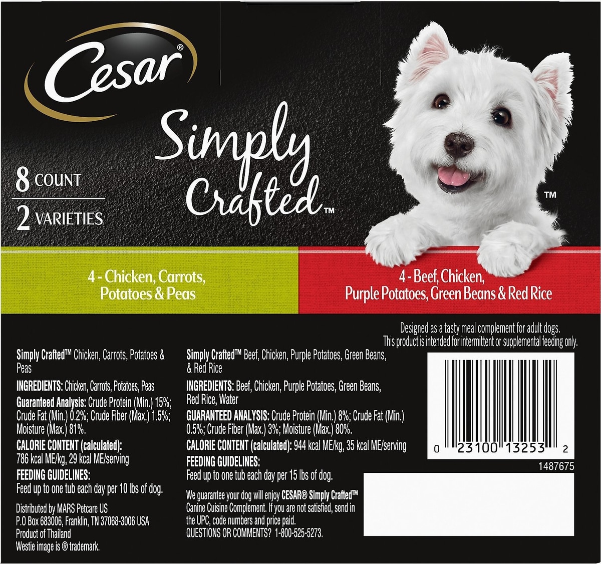 Cesar Simply Crafted is formulated as a meal complement for small adult dogs. With real chicken or beef as the #1 ingredient, plus delicious real veggies, they’re crafted to satisfy even the pickiest eaters.