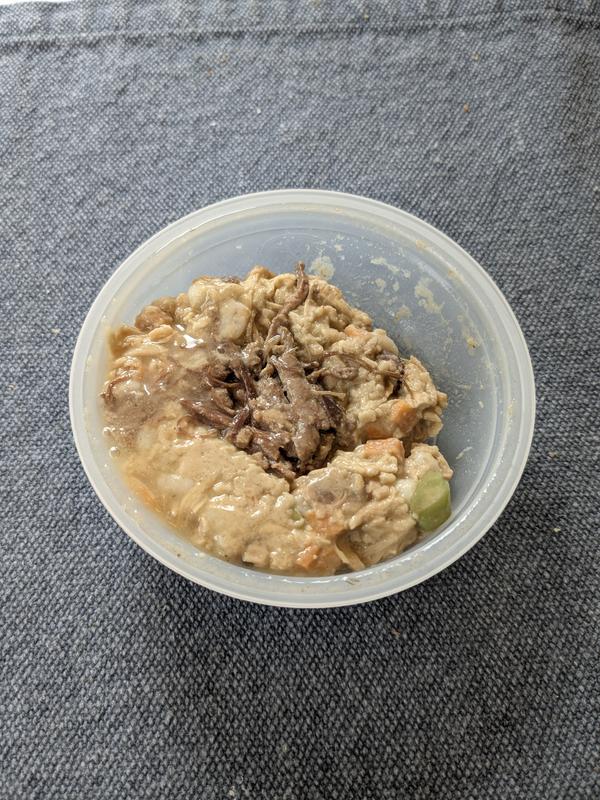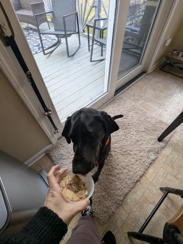 Quick recap: warmed up is a nice treat, not too stinky, and no stomach ache! My dog usually gets dry food with lamb. Chicken items often upset her stomach. So when we tried this wet food to add some moisture, I was skeptical. However, it was great. The product directions assume you're giving this wet food as a primary source of nutrition, so the serving size was way off base. It suggested I give my 50 lb dog 4 bowls at a time. I ended up just putting one bowl on top of her dry food and stirring it up a few times per week. She loves it. I love that I can put it in the microwave to take the chill out and it doesn't smell up the house, like some wet dog food.