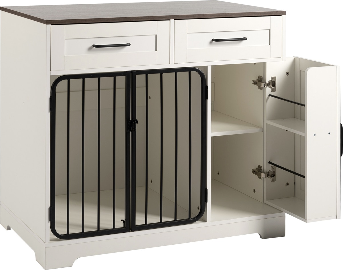 • Includes 2 large drawers and a cabinet with shelves for organized storage of pet supplies, toys, and snacks.