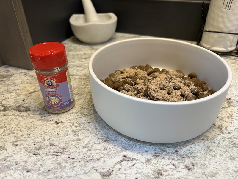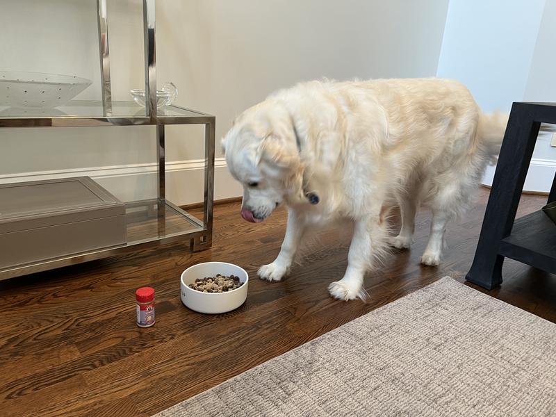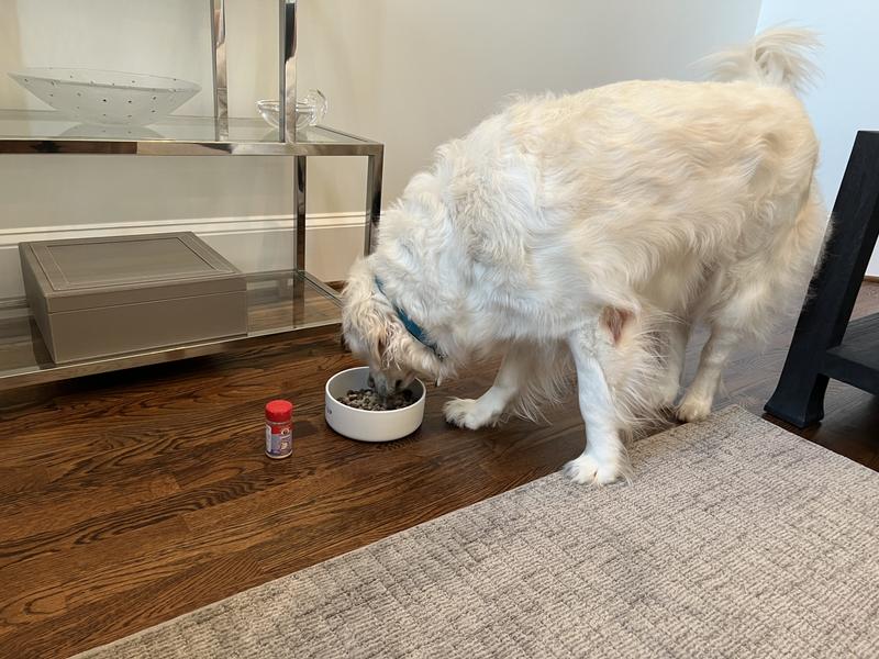 Flip open the handy shaker bottle and sprinkle on your dog’s food. Then watch every bite magically disappear!