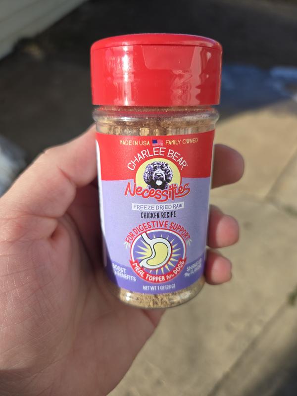My picky eater 3 y/o golden loved Charlee Bear Necessities Freeze-Dried Chicken Recipe Digestive Health Support Grain-Free Dog Food Topper. It comes in a shaker