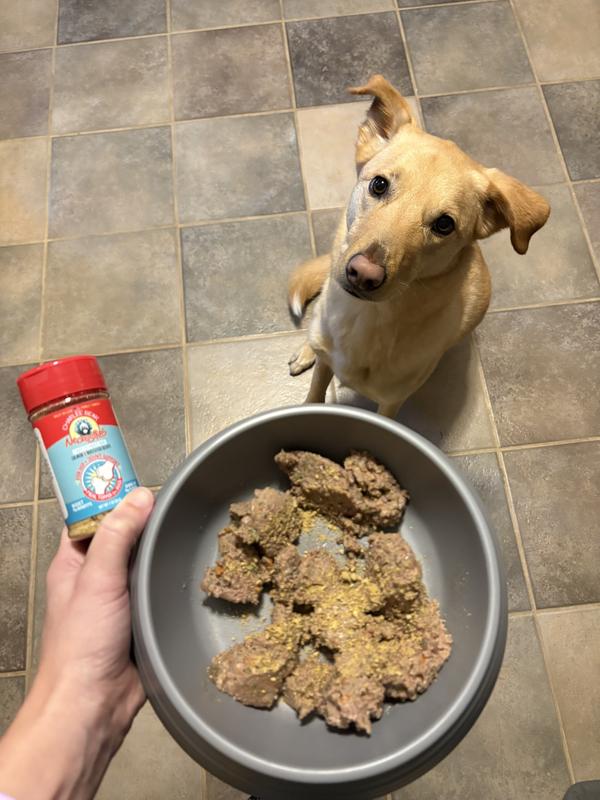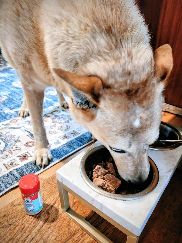 Flip open the handy shaker bottle and sprinkle on your dog’s food. Then watch every bite magically disappear!