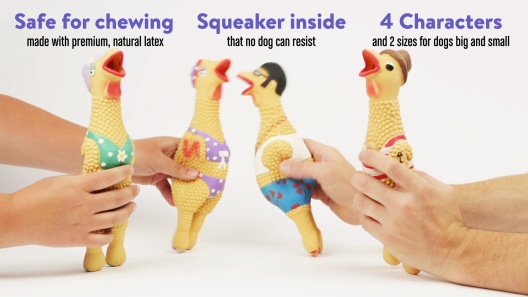 While this doesn't sound like a chicken, it features a silly, squawking fun squeaker.